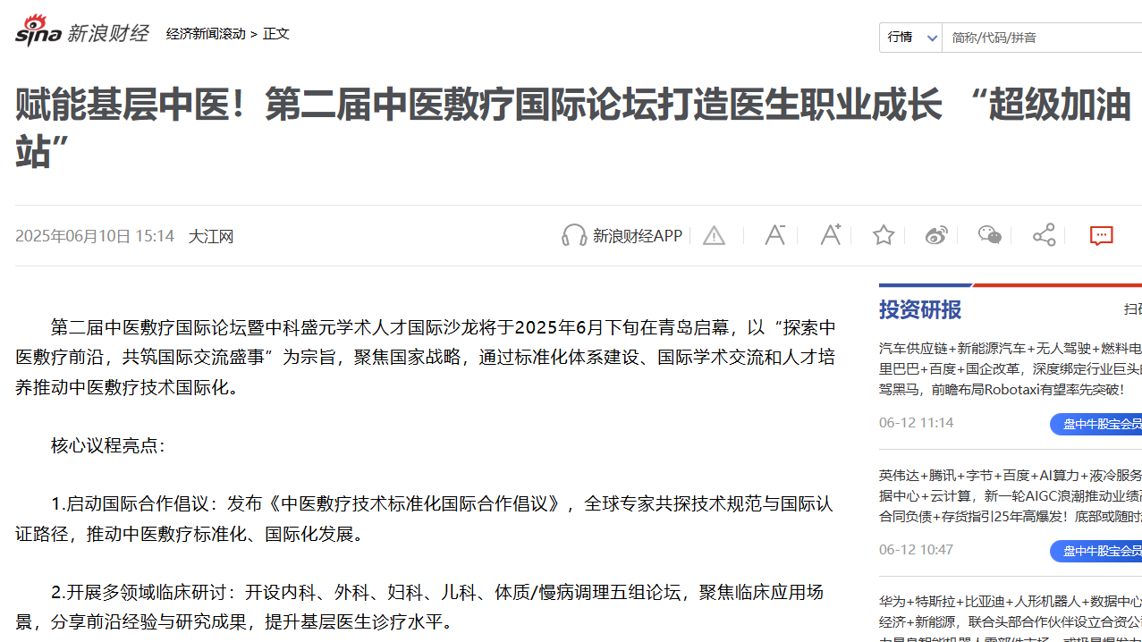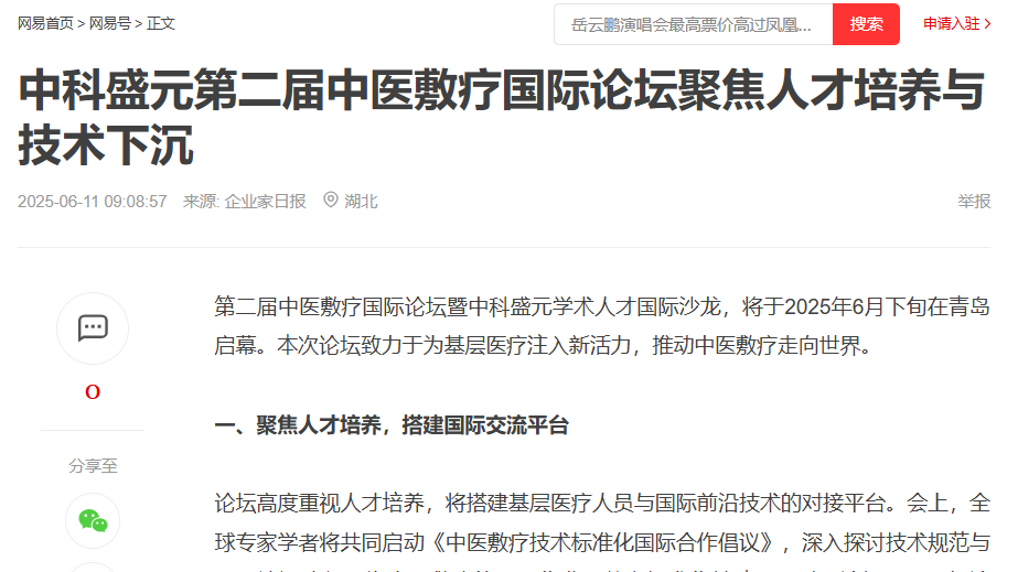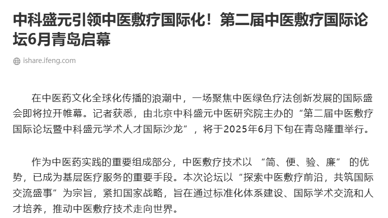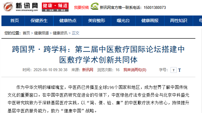 中华网、凤凰网、网易、新浪、国际新闻网、环球新闻网…… 超20家国内外主流媒体+行业垂直平台(含中华健康新闻网、第一健康网等)同步头条聚焦!当权威媒体罕见集体为一场中医药论坛“站台”,你会发现:中医敷疗技术正在成为全球医疗视野下的‘中国符号’,而这场论坛,就是引爆行业热度的核心引擎!