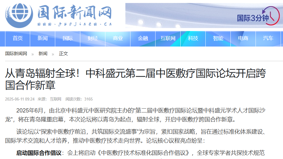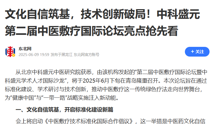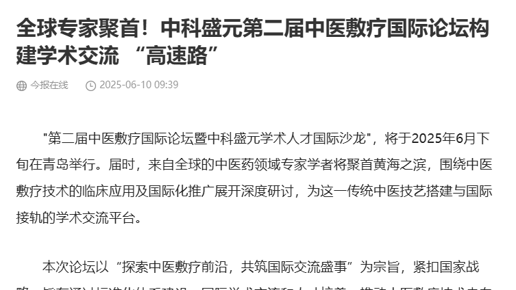 当中华网、凤凰网、网易、新浪等超20家主流媒体同时聚焦,当中医敷疗技术成为国际瞩目的“中国智慧”——“第二届中医敷疗国际论坛暨中科盛元学术人才国际沙龙”将于6月下旬在青岛盛大启幕!这是一场汇聚海内外专家、链接百万基层医疗工作者的国际盛会,更是推动中医敷疗技术走向世界的重要里程碑。